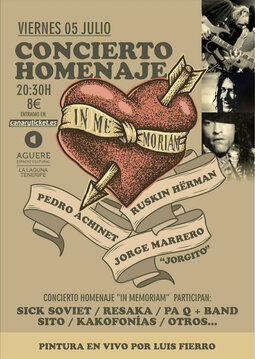 Este merecido concierto homenaje a estos tres grandes amigos y músicos de Tenerife - Canarias,( que fallecieron hace unos años) son; RUSKIN HERMAN Guitarrista y Mandolinista, JORGITO (CNT, Batería de grupos de rock), PEDRO ACHINET (Bajista de grupos de Reggae).